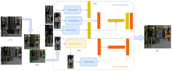 Workflow of our method: Given the video frame (1), the picture in the first line is the previous frame of the video, and the picture in the second line is the result of YOLOX detection. The tracking result of the previous frame and the image of this frame are predicted by the Kalman filter and matched with the detection result through IOU (2). For the high-scoring boxes in the detection boxes, after extracting its features, calculate the affinity with trajectories of the previous frame, and then match with each track (3); For boxes with lower scores, feature extraction is performed on the image after bicubic interpolation, and the affinity with the unmatched trajectories is calculated and then matched (4). Finally, the tracked result (5) is obtained.