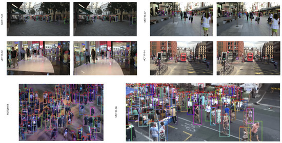 Visualization of tracking results on MOT17 and MOT20 test datasets. Boxes of the same color and numbers in the upper left corner of the box indicate the same tracking target. The method proposed in this paper has visible and effective effects on object density and occlusion.
