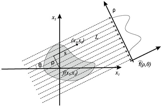 denotes an arc length differential along parallel lines L for all angles , s represents a parameter along the line L, and , are the usual Cartesian coordinates, as illustrated in Figure 1. We assume that the integral on the right-hand-side of Equation (1) has finite support for , as commonly considered in medical applications [24,25], i.e.,