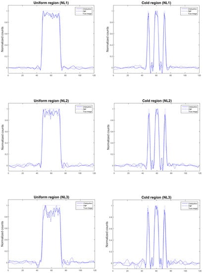 For the simulated NEMA IQ phantom, reconstructed images using Chebyshev and FBP for all noise levels are presented in Figure 2. The figure was created in the free software tool for multimodality medical image analysis AMIDE [40]. The reconstructions depicted in this figure are representative reconstructions of one out of ten Poisson noise realizations at all noise levels, namely NL1, NL2 and NL3, since no visual differences were apparent between the realizations simulated. In Figure 2, scalar values are represented accordingly in the colorbar, namely zero values are represented by the all-black color, whereas the maximum values of the simulated IQ phantom by the all-white color. By visual comparison, the FBP reconstructed images appear of higher noise than the Chebyshev reconstructed images. Furthermore, in Figure 3 we present the line profiles of the IQ phantom, in its uniform and cold regions, respectively, for all noise levels.