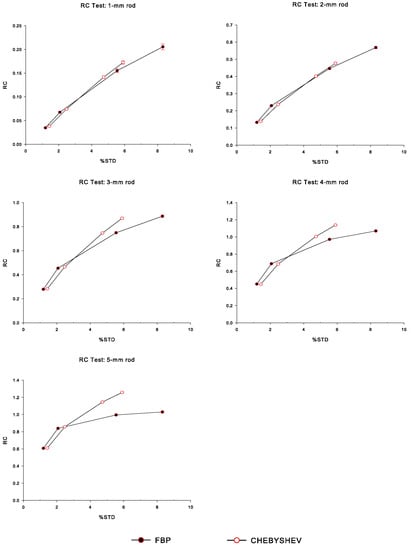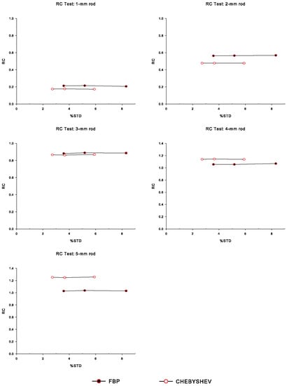 Figure 7 illustrates the versus plots, for each of the hot fillable rods (diameters 1 to 5 mm) of the simulated IQ phantom, for Chebyshev and FBP reconstructions, corresponding to all sigma values, namely from right to left: NL3 (no smoothing), 0.5×, 1×, and 1.5× sigma, respectively. We observe that, for all rod sizes, Chebyshev-based reconstructions exhibit higher values for between 3% to 6%, whereas, for between 1% to 2%, FBP reconstructions have higher values than the corresponding ones of Chebyshev. As expected, more Gaussian smoothing (larger sigma) leads to lower as well as values.