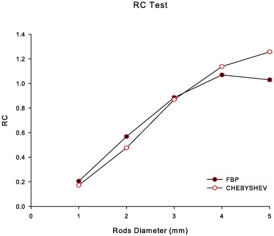 In Figure 5, we illustrate the values as a function of the five rod diameters of the simulated IQ phantom, namely 1 mm, 2 mm, 3 mm, 4 mm and 5 mm, for both reconstruction methods investigated. This specific plot may be referred to as the recovery coefficient curve. As shown in Figure 5, Chebyshev reconstructions exhibited similar values with FBP for the hot rods with diameters 1 to 3 mm, whereas for the hot rods with diameters 4 and 5 mm exhibited higher values. The values decrease as the rod size decreases for both algorithms [41,42].