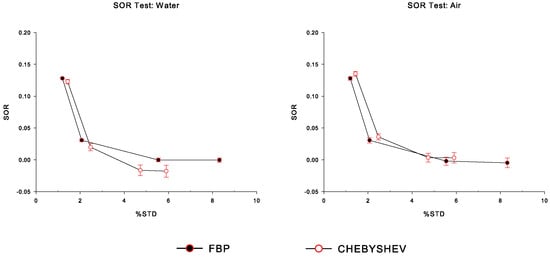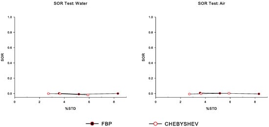 Spill-over ratio () measurements for the water-filled and air-filled chambers in the cold region of the simulated IQ phantom, as functions of percentage standard deviation (), for Chebyshev and FBP reconstructions, corresponding to all sigma values, namely from right to left: NL3 (no smoothing), 0.5×, 1×, and 1.5× sigma, respectively.