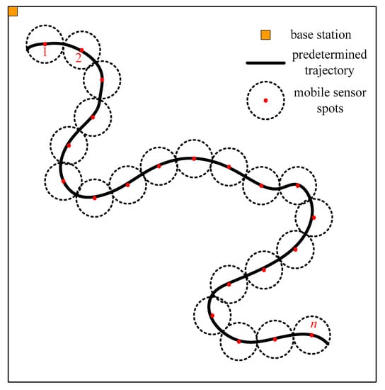 Consider a WSN model in which an object is planned to travel on a preselected path in a two-dimensional area. To monitor the object, m mobile sensors (e.g., drones) can be used. All the mobile sensors are located in an obstacle-free surveillance region. For convenience, assume that we can schedule mobile sensor nodes to n predetermined spots on the path for monitoring the object before it starts moving (Figure 1). All mobile sensors initially have an equal amount of battery power and are located at the same depot (base station). They also move at the same speed. Each mobile sensor route starts and finishes at the base station. Moreover, a mobile sensor can move to the predetermined position before the object arrives. To extend the network lifetime, we require a movement repertoire of mobile sensors such that the total traveled distance is minimized and as such that the remaining battery power of each sensor is as balanced as possible. We partition the object traveling path into several zones such that each mobile sensor must be placed in a zone once and only once to achieve a high balanced residual energy.