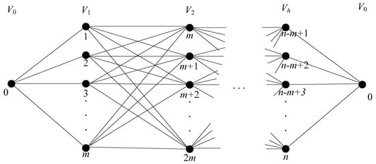 From a graph-theoretic perspective, the moving object coverage problem can be stated as follows. Let G = (V, A) be a directed multistage graph where V = {0,…, n} is the vertex set, and A is the arc set. The vertices i denote the positions to be reached and monitored, where 1 ≤ i ≤ n, and vertex 0 denotes the base station. The vertices can be partitioned into h ≥ 1 disjoint sets Vi with i = 0,…, h and h = , where m > 0 is the number of mobile sensors. Without loss of generality, we assume that n is a multiple of m. The sets of Vi, 0 ≤ i ≤ h, are such that |V0| = 1 and |V1| = |V2|= … = |Vh| = m, where V0 = {0} and Vi = {(i − 1)m + 1,…, im}, 1 ≤ i ≤ h. A nonnegative cost dij is associated with each arc ⟨i, j⟩ ∈ A, representing the Euclidean distance from vertex i to vertex j. We assume that loops on the same vertex, denoted by dii = ∞, where i = 1, 2,…, n, are prohibited. A route is defined as one starting from the base station, going through exactly one vertex in each Vi (where 1 ≤ i ≤ h), and ending at the base station. Each vertex in Vi (where 1 ≤ i ≤ h) must be visited exactly once. Consider a set M = {1, 2,…, m} of identical mobile sensors initially positioned at the base station and are able to move in two dimensions at a constant and homogeneous speed, where 0 < m < n. Each mobile sensor surveils a subset of vertices on the route. The goal is to find a set of routes that can both guarantee that each vertex is served by one mobile sensor and satisfy the constraints of the mobile sensors’ maximum allowable traveled distance. Furthermore, the size of the set should be smaller than the number of mobile sensors required, the total traveled distance should be minimized, and the traveled distance of the mobile sensors should be as balanced as possible. Let and be binary variables defined as follows: