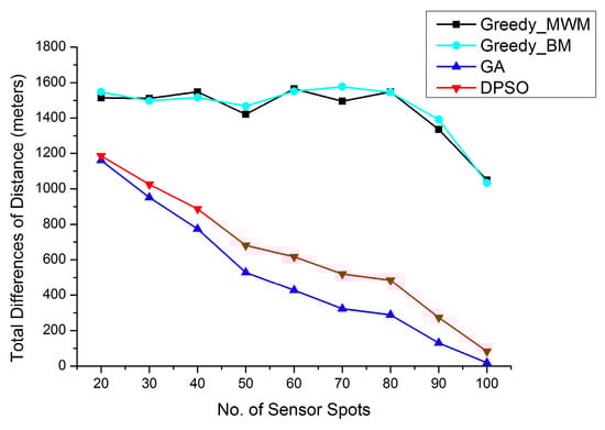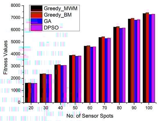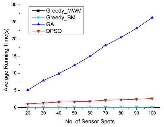 Figure 10 presents the effect of the number of sensor spots on the average running time required by the greedy algorithms, the GA, and the DPSO algorithm. The running time required by the greedy algorithms was less than 50 milliseconds, which is much less than that required by the meta-heuristic algorithms. Regardless of the number of sensor spots, the GA required considerably (approximately 4.8–10 times) more running time than did the DPSO algorithm. In short, the DPSO algorithm outperformed the GA with regard to average running time; therefore, the DPSO approach was more efficient in approaching the global optimum through evolutionary generation than was the GA approach.