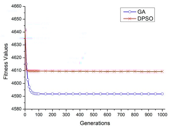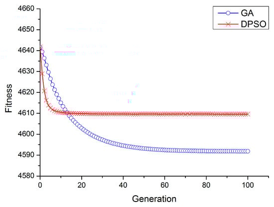 Figure 8 illustrates the effect of the number of evolutionary generations on the fitness function under the GA and DPSO schemes when n = 60, m = 5, and Ic = 100. With respect to the fitness values, the GA approach outperformed the DPSO approach after 15 generations and achieved solutions that were 0.3% better.