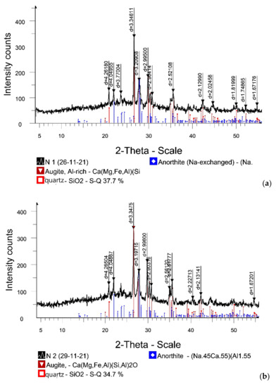 The interpretation of the diffractograms and semi-quantitative X-ray phase analysis indicated that augite was present as the main crystalline phase of the samples obtained from pure loam and with the addition of diatomite. In the sample with the addition of bentonite clay, the predominant phase was quartz. In all samples, anorthite was present in small amounts. The addition of diatomite contributed to the formation of a large amount of augite in the composition of the products, which led to increased strength. Although the sample based on loam without additives is dominated by augite, its compressive strength was found to be lower than the strength of the sample (Table 5) with the addition of bentonite clay, which was dominated by quartz (Figure 6d). Probably, the addition of bentonite clay improved the sintering ability of the ceramic shards due to the formation of a large volume of the glass phase, thereby increasing its strength.