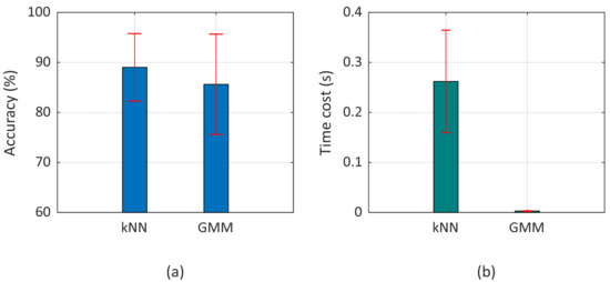 Comparison of k-nearest neighbor (kNN) and Gaussian mixture model (GMM) for movement recognizing. (a) Comparison of classification accuracy. The K in kNN is six, and the number of Gaussian components in GMM is three; (b) Comparison of average time cost for recognizing one movement.