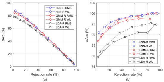 The classifier performance of LDA-R, kNN-R, and GMM-R on recognizing 12 trained hand movements with features extracted by using RMS and WL is shown in Figure 3. It can be observed in Figure 3a that the tAcc of kNN-R is the highest of all. The tAcc and aAcc of kNN-R and GMM-R are much higher than the LDA-R at the same rejection rate level. The performance of the classifiers with different features is different. GMM-R and LDA-R have a higher aAcc with WL feature than the RMS feature. However, for kNN-R, the RMS feature produces a higher accuracy than the WL feature at a low rejection rate, and then the aAccs of the two features tend to overlap at a high rejection rate. Therefore, for different classifiers, the more appropriate features are varied. For practical application, it is desired that the system has a low rejection rate and high accuracy. Considering the performance of kNN-R and GMM-R with the two features, the feature adopted by kNN is RMS, and the features used by GMM is WL in this study.