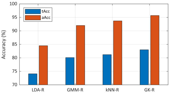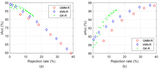 A grid search method has been applied to compare the performance of the three classifiers in Figure 4 at the same rejection rate level. When the rejection rate is 13.0% ± 0.5%, the tAcc and aAcc obtained by the classifiers are shown in Figure 5. It can be seen that the average tAcc and aAcc obtained from GK-R (δg = 65%, δk = 75%) are much higher than those results obtained by the LDA-R, GMM-R, and kNN-R classifiers. The improvements of GK-R in tAcc over LDA-R, GMM-R, and kNN-R are 9.0%, 2.9%, and 1.8%, respectively, and the improvements in aAcc are 11.2%, 3.7%, and 2.0%, respectively.