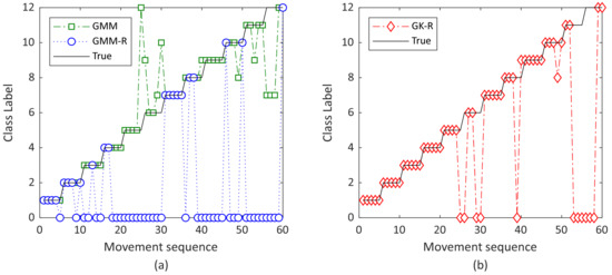 Figure 6 shows movement prediction using GMM, GK-R, and the first layer classifier (GMM-R) of GK-R for one subject performing 12 hand movements with five repetitions. It can be observed from Figure 6a that most of the test samples can be correctly recognized by the GMM classifier. Those samples that are wrongly predicted by the GMM classifier are all rejected by the first layer (GMM-R) classifier, although some samples that are correctly predicted by the GMM classifier but rejected by GMM-R. Figure 6b shows the prediction results with the proposed GK-R classifier. It can be found that the proposed model is effective in reducing the number of misclassifications in GMM with the help of the second layer classifier at the cost of increasing the number of rejections. However, misclassification is a much more severe problem than rejections for practical applications, especially when the rejection rate is limited.