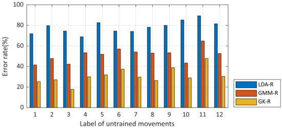 The leave-one-out error analysis (LEA) can be used to evaluate the reject ability of the classifier for untrained movements. If the classifier does not reject any untrained/unknown movements, it will result in an active decision, which is an error. So, LEA can be used to evaluate the ability of the classifier to decline untrained/unknown movement patterns. To assess the performance of the proposed classifier on unknown movements, each of the 12 hand movements is selected as an unknown movement sequentially, and the chosen unknown movement will not be used for training but used to test the trained classifiers. The classification result using the algorithms mentioned above is shown in Figure 8, obtained using the same parameters as Figure 5. From Figure 8, it can be observed that LDA-R and GMM-R classifiers have much higher error rates than GK-R in rejecting the untrained movements. The overall error rates of the LDA-R and GMM-R classifier are 78.3% ± 5.9% and 51.2% ± 6.7%, respectively, meaning they have unsatisfactory performances in rejecting the unknown movements. However, for GK-R, the error rate is reduced to 30.9% ± 7.6%, which shows a significant improvement.