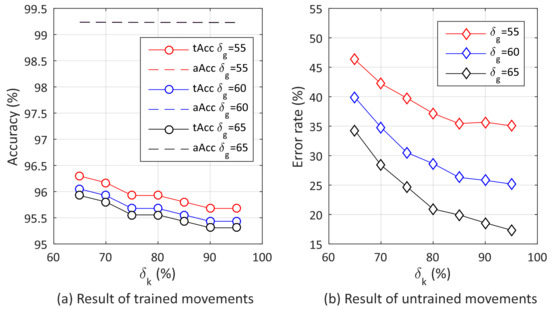 Figure 9 shows the performance of the proposed classifier on the six trained and untrained movements. The parameter δg varies from 55% to 65% with an increment of 5%, and δk increases from 65% to 95% with an increment of 5%. From Figure 9a, it can be found that the aAccs of different values of δg overlap with each other, and they are all 99.2%. Though the tAccs have different values, they show a similar tendency toward the increase of δk. For a smaller δg, more decisions are made by the first layer classifier, and fewer samples are rejected, which will result in a higher tAcc, as shown in Figure 9a. However, the side effect of a smaller δg is that the error rate of untrained movements will increase, as shown in Figure 9b. Therefore, when choosing the value of δg and δk, a compromise should be made between the accuracy of trained movements and the error rate of untrained movements. From Figure 9a,b, it can also be found that when the error rate of the untrained movements is 20.9%, the tAcc and aAcc of the trained movements are 95.6% and 99.2%, respectively. If we further increase the second parameter, the error rate of the untrained movements can reach 17.4%, while the aAcc will not be affected, and tAcc will decrease by 0.3%. The results have been much improved compared with [37].