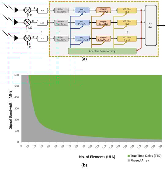 (a) Architecture of typical TTD-based wideband large-scale antenna systems (TTD—True Time Delay; ADC—Analog-to-Digital Converter; DDC—Digital Down-Converter; VFD—Variable Fractional Delay); (b) maximal signal bandwidth vs. number of elements [10].