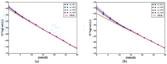 In order to evaluate the variance of the new algorithm, combined with the modified CRLB (Equation (22)), MATLAB simulates the variance and CRLB curves for different latency scenarios in different bandwidths. Figure 4a simulates the performance curve for , which shows that the variance is very close to the CRLB curve with an error of less than dB for dB. Additionally, the variance jitter due to is within dB. Figure 4b shows the performance curve under , where the variance and CRLB error are less than dB when dB.
