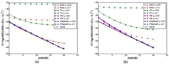 The proposed algorithm is compared with the existing approaches in [11] (marked as ‘Para’), [6] (noted as ‘Tri’), and [19] (marked as ‘FIR’), and the VFD parameters included in the simulation procedure are consistent with those of scenario 2. Here, the parameters of ‘FIR’ are set to and [19]. By comparing it with Figure 6, it can be seen that in terms of estimation, the ‘FIR’ algorithm outperforms the other three algorithms when the dB; however, the MSE of the proposed algorithm is closest to CRLB when the dB. The parabolic algorithm has a larger bias due to the increasing time-delay difference because of the misfit phenomenon, as well as being insufficient for broadband multichannel acquisition systems. Furthermore, Figure 6 obviously shows that the ‘Tri’ is more suitable for spread-spectrum communications [6] than the scenario described in this paper.