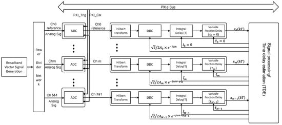 We give an example to illustrate the functionality of the proposed algorithm in practice. The broadband multichannel acquisition system based on NI PXI devices we delivered is mainly used to measure the functional performance indicators of the broadband digital correlator of the microwave radiometer, which is an embodiment of wideband large-scale antenna arrays [24], including multichannel receiving channel isolation tests, stability tests, and linearity tests. The approach involves using the time-delay difference estimation method proposed in this paper to calculate the multichannel consistency, isolation, correlation calculation accuracy to evaluate the performance of the broadband digital correlator. Meanwhile, this system can also be used to validate the processing algorithm of the integrated aperture receiver.