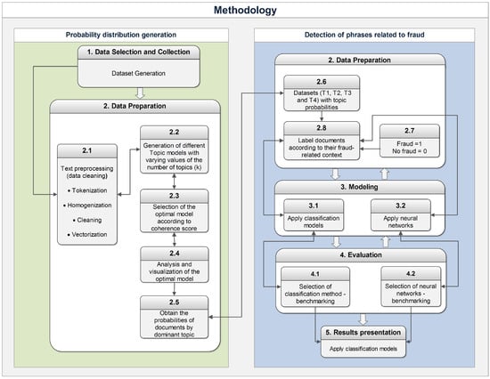 Once the probability that a document belongs to a specific topic is calculated through topic modeling, a balanced data set is obtained with records labeled as fraud and non-fraud. This data set allows training learning models to predict potentially fraudulent behavior. This is illustrated in the second flow chart of Figure 2.