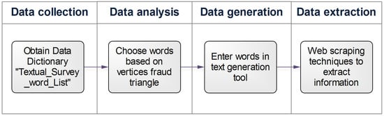 Data sets involving fraud-related behavior are scarce due to several reasons, e.g., due to confidentiality policies of institutions, or due to the sensibility of the personal data included. Given the restricted access to this information, it is common to use synthetically generated data sets [61,62]. Our data set was created from a dictionary of fraud-related keywords that were purchased from the company [63]. These keywords are tagged into different categories, including pressure, rationalization, and opportunity, the three components of the fraud triangle theory. Starting from several of these keywords related to the fraud triangle theory and using different online tools to generate sentences, as in [64,65,66], the corresponding sentences including the selected keywords were obtained. These tools allow the generation of sentences based on a specific word with a well-defined grammatical and semantic structure. Finally, they use a web scraping tool, “Firefox Addon”, which allows us to save the generated results and export them in CSV format for processing. The process followed to generate the data set is shown in Figure 3. Additionally, following the same procedure, several documents not related to fraud were generated in the same proportion as those related to fraud, with the only difference being that, for this case, keywords not related to this phenomenon were chosen, thus obtaining a balanced data set.