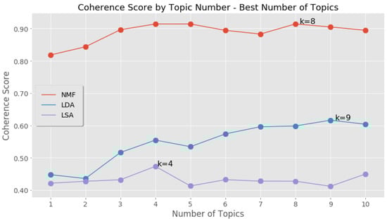 The most relevant and used topic modeling methods are LSA, NMF, and LDA. In related research, it was observed that the effectiveness of these algorithms differs in terms of the amount and type of data to be processed. In most cases and particularly for large data sets, LDA proved to be more efficient than other methods when identifying coherent topics [72,73]. In more specific cases, NMF outperformed the others [74]. In general, NMF and LDA are similar, but LDA seems to be more consistent [75]. Although the use of LDA has become popular when handling big unstructured data, selecting the best option for topic modeling might depend on the particular data being processed. Consequently, benchmarking the efficiency of these algorithms in this context is required. First, we identify the appropriate number of topics based on the resulting coherence value of each model. This approach enables us to analyze the performance of the topic mentioned above modeling algorithms and, in particular, to identify the one that more concisely and coherently learns such topics. Having identified the k parameter (number of topics) for models obtained from LDA, NMF, and LSA, we select the algorithm offering the highest coherence value, which identifies the end of the rapid growth of coherence between topics, thus offering meaningful and interpretable topics. From this analysis, a quantitative evaluation of the topic modeling techniques is carried out, which consists of measuring the coherence of the topic over a model’s topic and topic–article assignment output, which will indicate an approximate measure of the quality of that result.