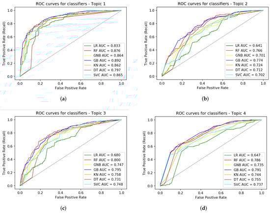 - Once we select the appropriate topic analysis technique, we use the documents’ probabilities on the assigned topic to determine if a text can be identified as being fraud related, using supervised machine learning models. For this purpose, we conduct experiments on seven classification methods, including logistic regression (LR), random forest (RF), gradient boosting (GB), Gaussian naive Bayes (GNB), decision tree (DT), k-nearest neighbor (kN), and support vector machines (SVM), using the synthetically generated data set.