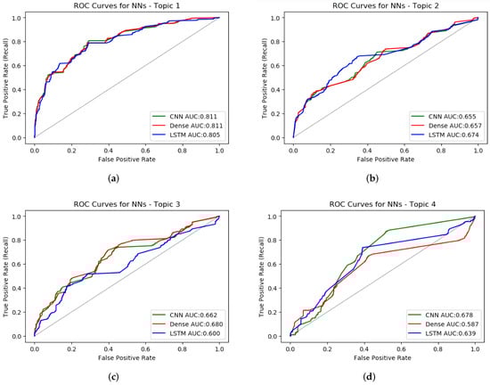 - Furthermore, we perform the same experiment using deep learning techniques, such as convolutional neural network (CNN), dense neural network (DNN), and long short-term memory (LSTM), to determine the performance’s differences using receiver operating characteristic (ROC) curves based on the area under the curve (AUC) with the traditional ML classification methods. The goal is to show which technique is more compatible to work with topic modeling to detect suspicious behavior of fraud.
