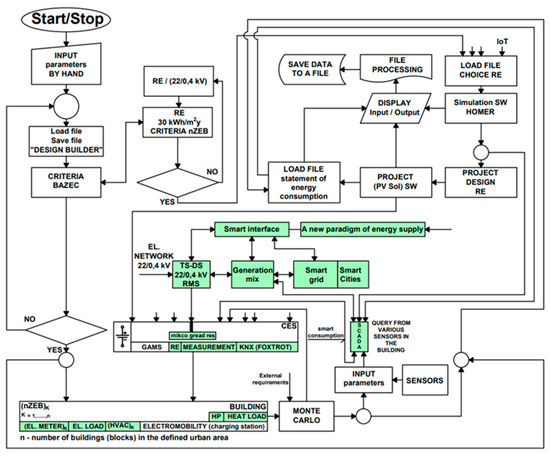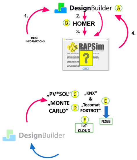 2.year. In addition, the average heat transfer coefficient Uem was evaluated for certification purposes. In order to compare the permissible EPB values, the parameters determined by a reference building of the same type and set of characteristics listed in Decree 78/2013 Coll. were defined. As different software tools in the new EMB with IoT integration were used to simulate parts of the concurrent simulation of each commodity, a wide range of software tools were analyzed from an energy planning perspective. None of these software tools deals with the issue of coupling individual characteristics of the partial energies themselves within the building, but this coupling needs to be considered in a city context where the city’s layout significantly affects the consumption of all energies. The building simulation tool DesignBuilder; the RES microgrid optimisation and design software HOMER, including the PV*SOL software for photovoltaic system design and battery storage implementation; and Monte Carlo software for determining the electric power demand for electrical vehicles (EV) charging represent some of the most commonly used examples of these tools. Although in principle it should be possible to use these simulation tools for large-scale applications, there is no comprehensive study that reflects the modelling process, as well as the inter-comparison of inputs, outputs, and the validity of these tools. For this reason, the future direction of our research has to be highlighted, which is a scientifically sound EPB modelling tool to compare inputs and outputs in terms of optimizing energy performance, energy sustainability, and energy efficiency.