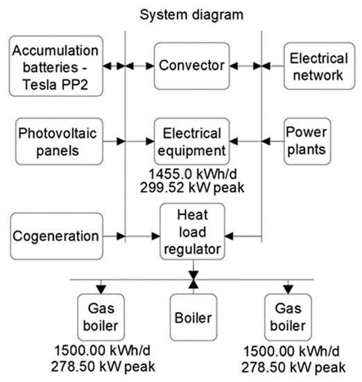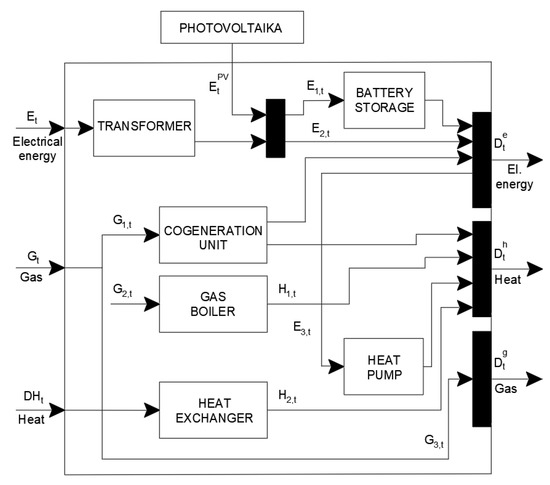 We will show only the module of the third EnergyHub program. Option 3 has components: transformer, cogeneration unit, gas boiler, battery storage, heat pump, and photovoltaic system. Variants 2 and 1 just mention the information of their composition. They contain the following components.