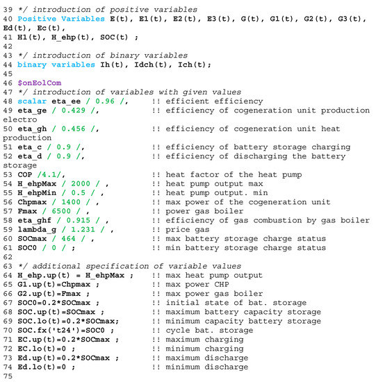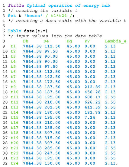 To compile the program model code, we enter the input data, and then the GAMS program calculates the value of the purpose function. The basis for the calculation is the hourly energy consumption and electricity prices. These energy prices are always dependent on the current tariff.