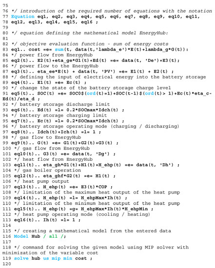 We applied GAMS for the purpose of designing the city energy center (EnergyHub) in the defined area of Prague 6-Bubeneč. This is an effective optimization method that has been used for our purpose. We will briefly introduce the source codes for the compilation and calculation of the proposed variants (three variants) of the Energy Node.
