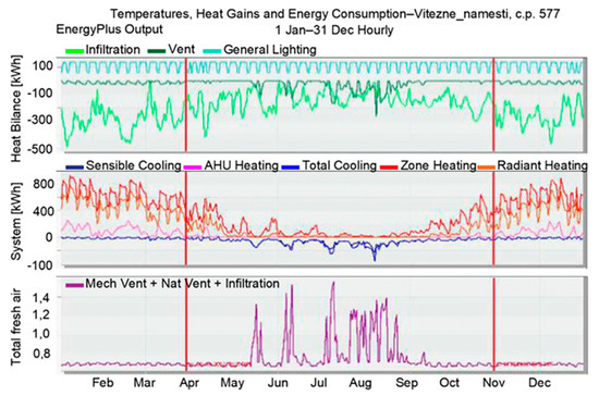 After adjusting the display of the results, a comprehensive analysis and comparison of the energy characteristics of the building can be performed (see Table 1 and Table 2). In the settings, the user can choose which variables are included in the display of the internal boost, fuel degradation, and comfort or fuel graphs, including CO2 values. All this information can be displayed as a graph, table, or summary.