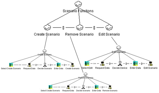 Task & Concepts (T&C) describe the various user’s tasks to be carried out and the domain-oriented concepts as they are required by these tasks to be performed. The task model provides a description of each task in a workflow of the IoT System; those tasks are Enable Access, User Functions, Device Functions, Scenario Functions, and Report Functions. The Enable Access workflow works like any login system, i.e., the system validates any user in the system and requires a username and password to access to the next abstract functions. The user’s needs identified include CRUDs for user, devices, scenarios, reports, and a special comment on data visualization. In this paper, the scenarios specification is our main concern. There is no magic around the tasks needed to handle scenario definitions (see Figure 2). It is also just to create a scenario task and to add devices to it. The interesting aspect is on how to convey this data to the user.