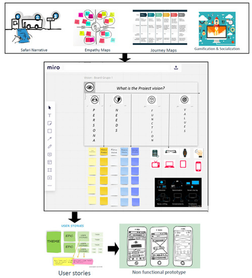A complete overview of user needs is the result of previous steps. An understanding of how they perceive the problem is needed. Then, the co-design process starts. In the middle of Figure 3, the board for the co-design is shown. The results of the process are the vision board of the project, PERSONAS, user need, and functionalities, and the value added to user’s life is written at the end. Functionality is defined by working around canonical task types [44]. Tasks were defined in the previous steps; at this point, the question is how they are going to be implemented. For instance, a selection of how many objects are involved is determined by the number of possible answers, with 2 to 4 radio buttons or checkboxes used as an option. If the numbers of options increases, then a different interactive object might be used.