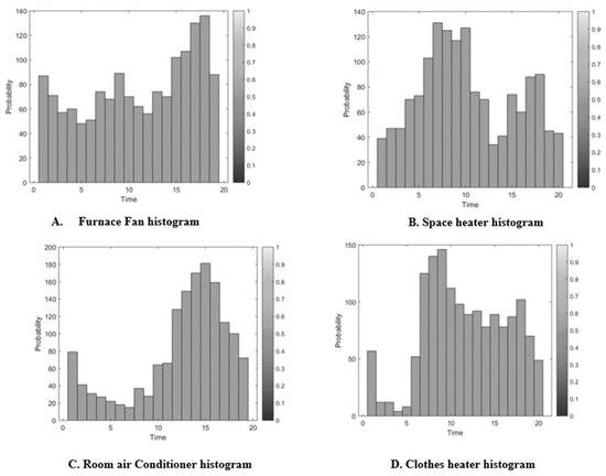 In Figure 5A is showed furnace fan histogram. It is possible to see from this that the shape is like PDF´s furnace fan, as reported in [47]. The same thing happens with Figure 5B–D compared with PDS’s corresponding devices.