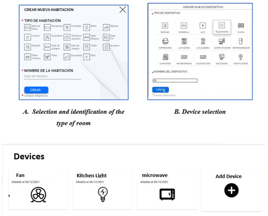 Interactive system to set the different real-life scenarios: (A) Users’ scenarios or rooms definition where the different devices could be added by using the (B) device selector interface.