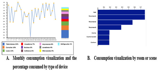 Once the rooms have been created, it is possible to make the consumption visualization by selecting either the month or the week that is desired. If the selected period is monthly, the display of consumption can be conducted by device or by scenario. In the visualization of consumption by device, a graph is presented that projects consumption over the course of the month, as well as the percentage to which it corresponds according to total consumption (Figure 7A). In the option of the visualization by scenario, the consumptions and the percentage of each of the scenarios for the selected period are shown (Figure 7B).