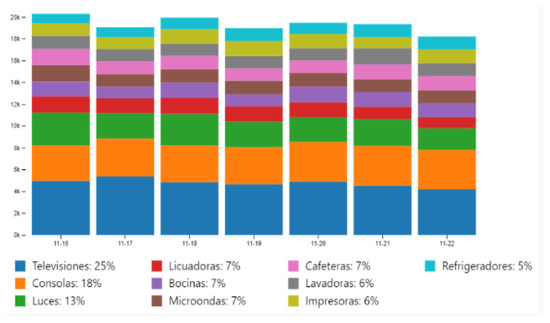 If the viewing period is weekly, the graph shown for this option shows the percentages of consumption per week (Figure 8). In the fusion module the consumption and status profiles of ten devices are created (heater, air, fan, dryer, dishwasher, stove, microwave, washing machine, refrigerator, spotlight), the data corresponding to the washing machine, fan, heater, and dryer devices being provided by the simulator, and the data of the remaining six devices being generated thereby. Each of the files corresponds to each of the twelve months that make up a year. The number of rows in each of the files is the result of multiplying the number of days according to the month it refers to by 24.