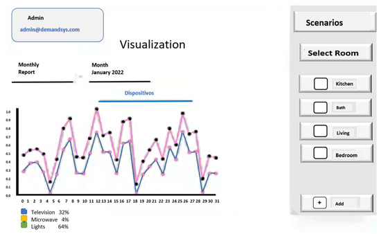 The implementation of an interactive system [29,32,33,34] as part of a home energy management system encourages the user to make changes in consumption behavior, as it makes him/her act efficiently and consciously, thus generating a transparent, dynamic, controllable, and intelligent environment [35,36,37]. It also provides convenience by simplifying the control and operation of electrical devices [38]. The interaction system is a means to make a virtual representation by creating objects [39] of the identified context, the interactive system groups the data with respect to the implementation target [31,40,41]. The system interface must have the characteristic of being flexible, accessible, and intuitive as a SCADA system [42], allowing the inclusion of more virtual objects to the system. The presentation of consumption data through the interface [38] reduces consumption by 3% to 13% [31].
