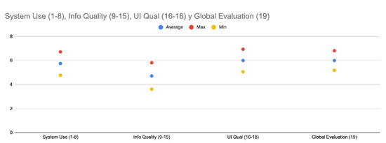 In general, in Figure 10 the results are displayed, the platform developed is perceived as acceptable (6 global average) by most users. To interpret what it means we must go into the details of each group of questions. In the first instance, the first block of questions (1–8) analyzes the quality of the system in the functional sense, “It solves or not my needs and I feel satisfied”, from any point of view, globally or by a particular group of users; this is the criterion that has the 5.8, so the functionality of the system is quite acceptable. The second block of questions refers to the quality of messages, texts, and all kinds of written language present on the platform. This item was also perceived as acceptable in general (4.5). However, this block of questions reflects what is interpreted as the most significant usability problem of the platform. It can be summarized as the lack of feedback in any modality, visual or auditory, on the actions that the user is executing on the platform. Feedback is defined as the mechanism used to communicate the result of an action to users. It can involve using any sensory channel (auditory, visual, tactile). Finally, the analysis of the User Interface (questions 16–17) is presented, with a value of 6, which is the highest criterion evaluated by users. Design is everything in our proposal and this was well perceived and accepted by users. Our feeling is that we need to improve the way we communicate information in order to get a better value when asking users about using the platform in the future.
