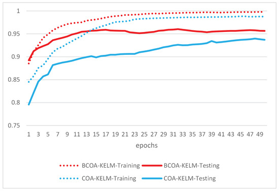 Figure 1 shows the variation of the average diagnostic accuracy with the number of training epochs for BCOA and COA, for both the training and test datasets. It can be seen that either curve is steadily converging. It can be seen that the average diagnostic accuracy of BCOA and COA for the training dataset is higher than that of the test dataset, which can indicate a reasonable selection of data. At the same time, the graph clearly shows that BCOA reaches its accuracy maximum at 10 epochs, while COA reaches its accuracy maximum after 20 epochs, which can indicate that BCOA has made a major breakthrough in terms of convergence speed.