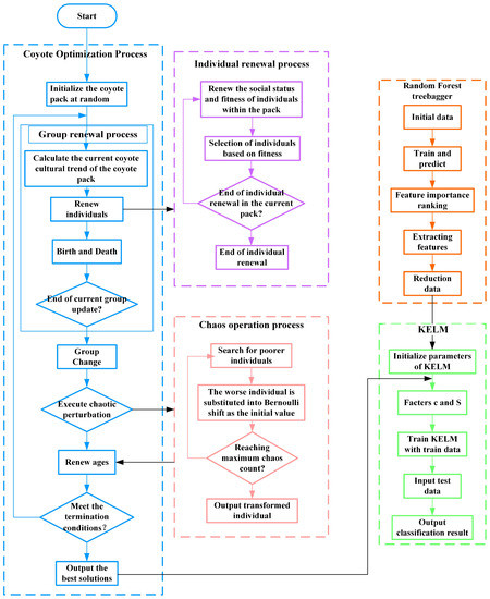 - We introduced chaotic mechanism and Bernoulli shift into COA, and proposed a new algorithm Bernoulli shift coyote optimization algorithm (BCOA). The algorithm is able to perform more accurate local exploitation in late iterations, speed up convergence, and better maintain the population diversity of coyotes in individual updates. We combined BCOA and KELM classifiers to improve KELM’s being prone to fall into local extremes in the iteration.