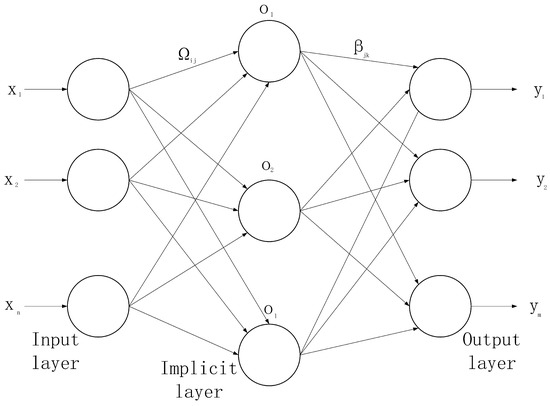 A typical single implicit layer feedforward neural network structure is shown in Figure 3 [52], consisting of an input layer, an implicit layer and an output layer, with the input layer fully connected to the implicit layer and the implicit layer to the output layer neurons. The input layer has n neurons corresponding to n input variables, the hidden layer has l neurons, and the output layer has m neurons corresponding to m output variables. For the sake of generality, let the connection weights between the input and hidden layers be: