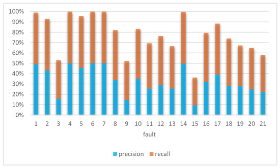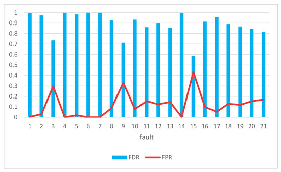 It is commonly recognized that the problematic points in chemical process diagnosis are 3, 9, 15 and 16. As can be seen from the figure, the fault diagnosis rate of the rest of the methods for these four types of errors is often low and often below 50%, while the fault diagnosis rate corresponding to errors 3, 9, 15 and 16 of the present method reaches 0.7354, 0.7125, 0.5886 and 0.9146, which can be said that the present method has effectively improved the fault diagnosis rate for faults 3, 9 and 16. Furthermore, the fault diagnosis rate of 0.9146 for fault 16 is significantly higher than that of other methods, demonstrating that BCOA-KELM has made a significant advance for fault 5. The proposed method has the best FDR performance among the diagnostic methods for the TE process, demonstrating the proposed method’s superiority.