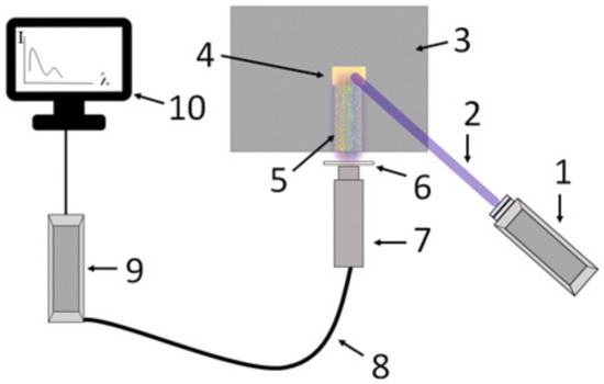 Schematic representation of the experimental setup based on the 405 nm continuous laser: 1—laser, 2—laser beam, 3—screen for the fixation of a sample, 4—the sample, 5—fluorescence, 6—optical filter, 7—collimator, 8—optical fiber, 9—spectrophotometer, 10—PC for registration of spectra.