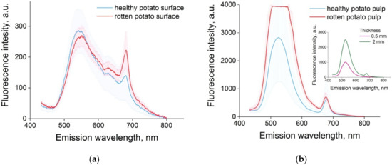 Healthy and rotten potato surface is less different in fluorescence spectra in contrast to apple. The peak of chlorophyll (680 nm) for healthy potatoes is less pronounced than for the rotten samples, and the peaks in the green region (530 nm) are the same (Figure 6). However, there are reliable differences in the pulp. The spectrum of the rotten sample goes beyond the sensitivity of the spectrometer in the green area (Figure 6b). This can be explained by the assumption that rotten potato pulp absorbs laser radiation much more efficiently, which leads to increased fluorescence. The efficiency of fluorescence quenching is rather high for the healthy plant, so any damage of the plant material should result in a change of its chemical composition; thus, this will decrease the quenching efficiency and hence the induced fluorescence intensity should be increased. Additionally, bacteria and fungi in rotten potato had high fluorescence, so with the increase of such organisms’ concentration, the fluorescence will be higher.