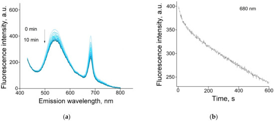 (a) Changes in the fluorescence spectra of potato pulp for 10 min; (b) fluorescence kinetics of potato pulp at a wavelength of 680 nm for samples with a thickness of 0.5 mm.