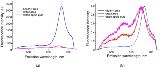 In Figure 5, the spectral differences between healthy and rot-affected fruits are visible. In samples affected by rotting, the peak of the maximum of chlorophyll is shifted from 680 nm to 675.5 nm, indicating a decrease in chlorophyll concentration. The second difference in the surface is the “plateau” between peaks in green (520 nm) and red (680 nm) regions. Healthy samples do not show a significant decrease in intensity between peaks. This plateau in the yellow-orange region (550–650 nm) is most likely due to the presence of riboflavin, carotenoids, and flavonoids [19]. The differences are even more pronounced for the apple pulp (Figure 5b). The fluorescence amplitude of the apple pulp affected by rot is reliably much smaller than the healthy specimens in the whole investigated region.