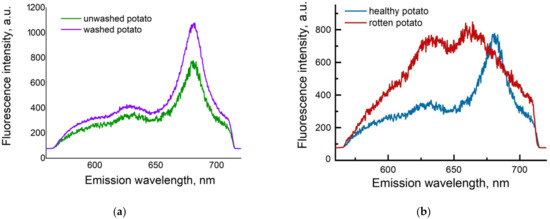 The spectra of whole potatoes of different potato samples are quite different from each other (Figure 10b). There is a significant shift of chlorophyll peak to the region of shorter wavelengths for the rotten sample. The 680 nm peak is more pronounced than the 630 nm peak for healthy potato samples of the “Udacha” cultivar.