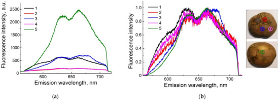 (a) Pulsed fluorescence spectra of pulp of “Udacha” (conditionally healthy) potato; (b) fluorescence spectra of pulp of “Zhukovsky” (conditionally rotten) potato.